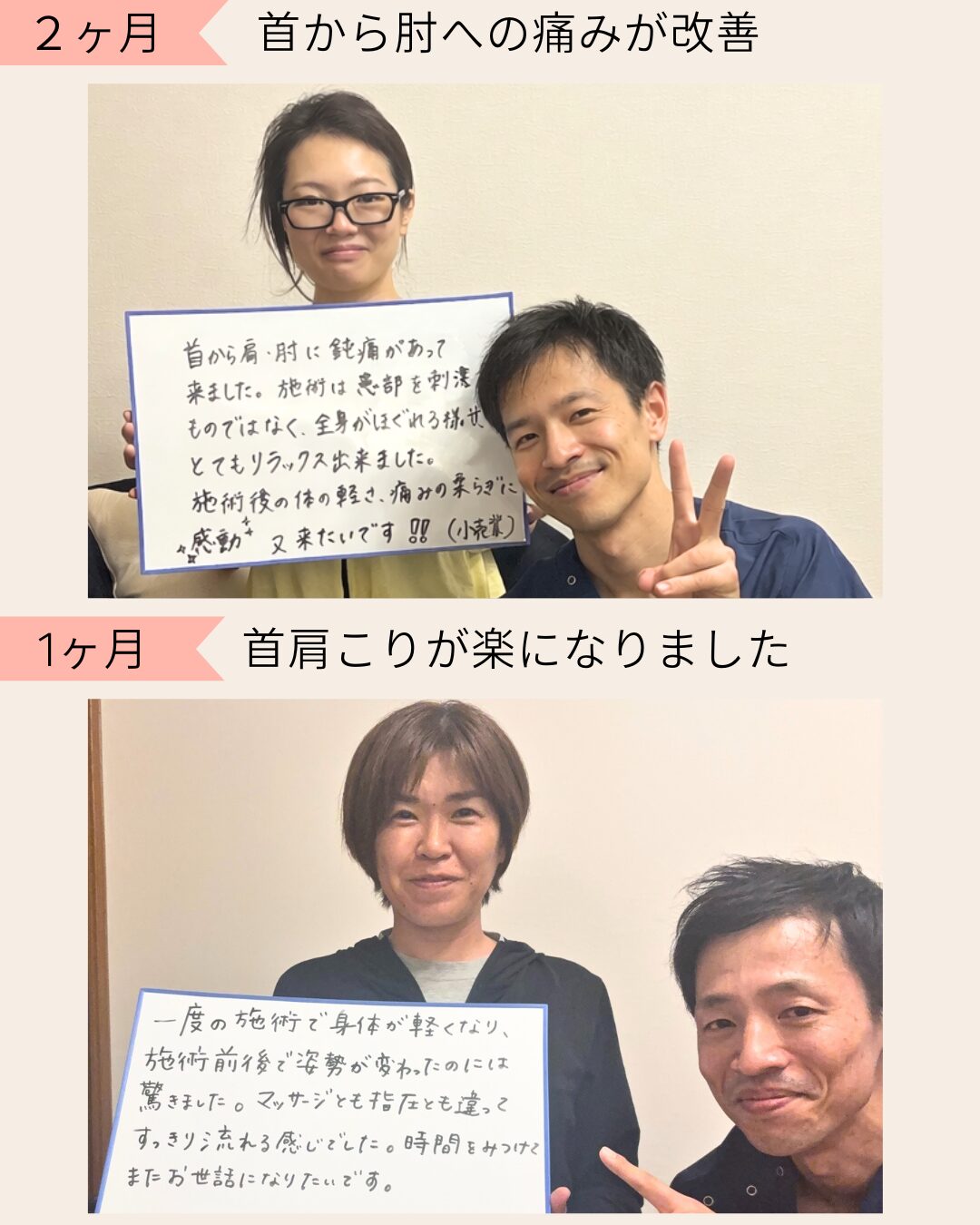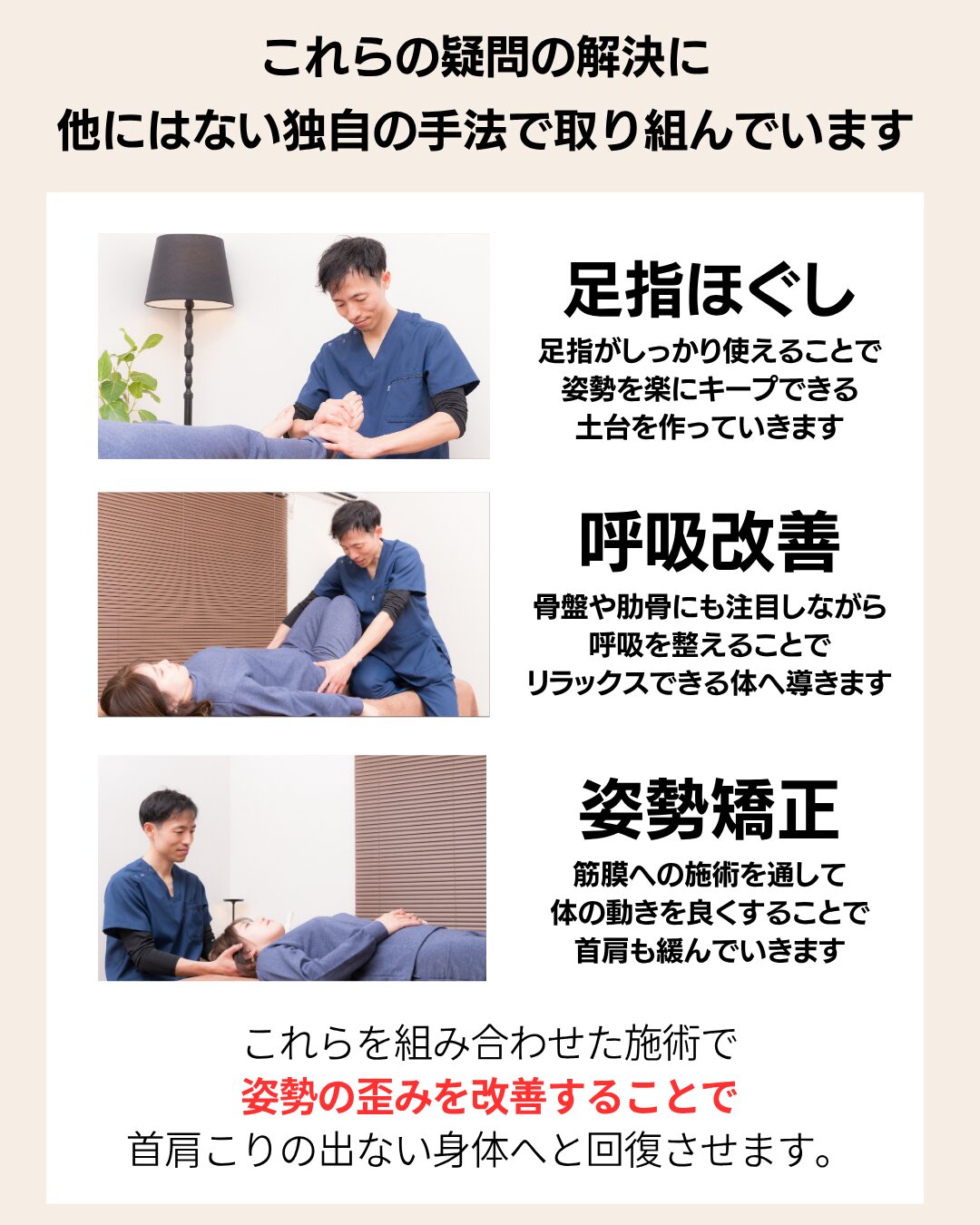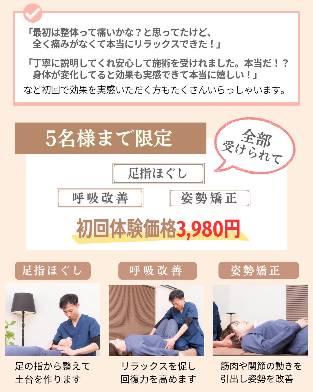 に投稿されました ユリッチTrustindex は、レビューの元のソースが Google であることを確認します。 腰痛が気になり来院しました。最初は日常生活でも違和感がありましたが、4回目の施術あたりからかなり楽になり、動きやすさを実感できるようになりました。 サロンの雰囲気は落ち着いていてリラックスでき、安心して通える空間です。先生もとても話しやすく、その時の状態をしっかり見ながら丁寧に施術してくださるので信頼できます。 毎回、施術前後に写真を撮っていただくのですが、その変化に驚きます。見た目も引き締まったように感じられ、身体のバランスが整っているのがよく分かります。 また調子が悪くなった際にはぜひお願いしたいと思います。ありがとうございました。に投稿されました 中村未紀Trustindex は、レビューの元のソースが Google であることを確認します。 施術直後はどう良くなったかがわかりませんでしたが、翌日になんとなく体が楽になっているような気がしました。偏頭痛持ちで、今回利用させていただいたので、今後も通ってみようと思います。に投稿されました M HTrustindex は、レビューの元のソースが Google であることを確認します。 長年、下半身太りと猫背に悩んでいましたが、ここに通って原因が「姿勢や体の使い方」にあることを丁寧に教えてもらえました。 毎回説明がとても分かりやすく、納得しながら受けられるので安心感があります。 正しい立ち方や歩き方を意識するだけで呼吸が楽になり、日常生活がかなり快適になりました。 目線も自然と前を向くようになり、自分でも姿勢の変化を実感できています。 その場だけ楽になるのではなく、根本から整えてくれる整体だと思います。 先生もとても信頼できるので、これからも通い続けたいです。 姿勢改善や体型に悩んでいる方にぜひおすすめしたい整体です。に投稿されました レオTrustindex は、レビューの元のソースが Google であることを確認します。 落ち着いた雰囲気のお部屋でアロマかな?良い香りも心地よかったです。 問診票の記入と全身の写真を撮っていただいてからの施術です。 施術自体は痛みを感じることなく、丁寧に説明してくださったりアドバイスもいただけるし、自宅でも出来ることを教えてくださいます。 施術後の体はスッキリした感覚でした。 ありがとうございます!に投稿されました ユウTrustindex は、レビューの元のソースが Google であることを確認します。 慢性的な首から肩にかけての鈍痛、肘の痛みと腕の痺れがあり、来店しました。初めての来店で不安でしたが、丁寧な問診に、先生の人柄がよく表れていて、施術も安心して受ける事ができました。 患部に刺激を与えない方法は、他の整骨院やマッサージ店とは全く違っていて、痛みとは関係が無いと思う場所も、実は関わりが深いそうで、こちらから色々と質問した事に対して、丁寧な説明を受けながら、全身の筋肉をほぐして下さる優しい施術でした。 清潔感漂う、落ち着いた暖色系の照明を使用した、アロマの香りのする素敵な空間にピッタリな施術で、気がつくと少し眠っていました。施術前とは比べられないほど全身が軽くなり、驚くほど痛みがなくなりました。 仕事に家事に追われ、自分の時間、リラックス出来る時間が限られている方に、是非行ってみて欲しいです。ハマると思います、自分へのご褒美も兼ねて、今後も通いたいと思いました!実際に施術を受けた翌日から1週間ほど経ちますが、痛みや痺れは無く過ごせています。 即効性もありましたが、この効き目を持続させる為のセルフケアの方法を教えて下さる点も、他店とは違う魅力を感じました。筋肉がほぐれる事で、血行も良くなったのか、むくみも軽減されています。 セルフケアの効果も実感していますが、痛みを再発させない為にも、また行きたいと思います!!に投稿されました RTrustindex は、レビューの元のソースが Google であることを確認します。 お世話になって1ヶ月ほど経ちました。 もう何年も前から右肩甲骨、右肩、右首筋、頭痛がありかなり辛い思いをしていました。 側湾症で(手術はしたが)やはり今までの蓄積は大きく体のバランスが悪く色んなところにも症状が出てました。 けど、先生に施術をしていただいた後はすごくバランスが良くなり体がすごく動きやすく生活がしやすくなりました! 主訴だったところも良くなるのを期待しこのままお世話になろうと思います^ ^ 先生も気さくで話しやすく、個人でしてらっしゃるので整骨院みたいなバタバタ感がなく ゆっくり丁寧にしてもらえるのでとても良いです⭐︎ 私みたいに側湾症で辛い思いをしている人、 肩や首からがしんどい人にぜひおすすめしたいです!に投稿されました くるりんTrustindex は、レビューの元のソースが Google であることを確認します。 慢性的な腕の痛みがあり、重だるく、日によっては痛みが酷かったり、痺れたり。病院に通院もした事はありましたが、特に骨や筋に