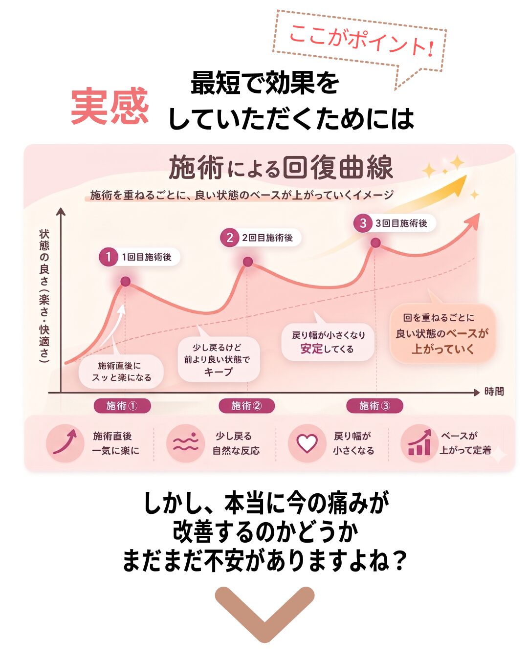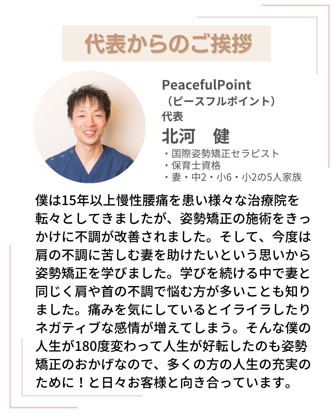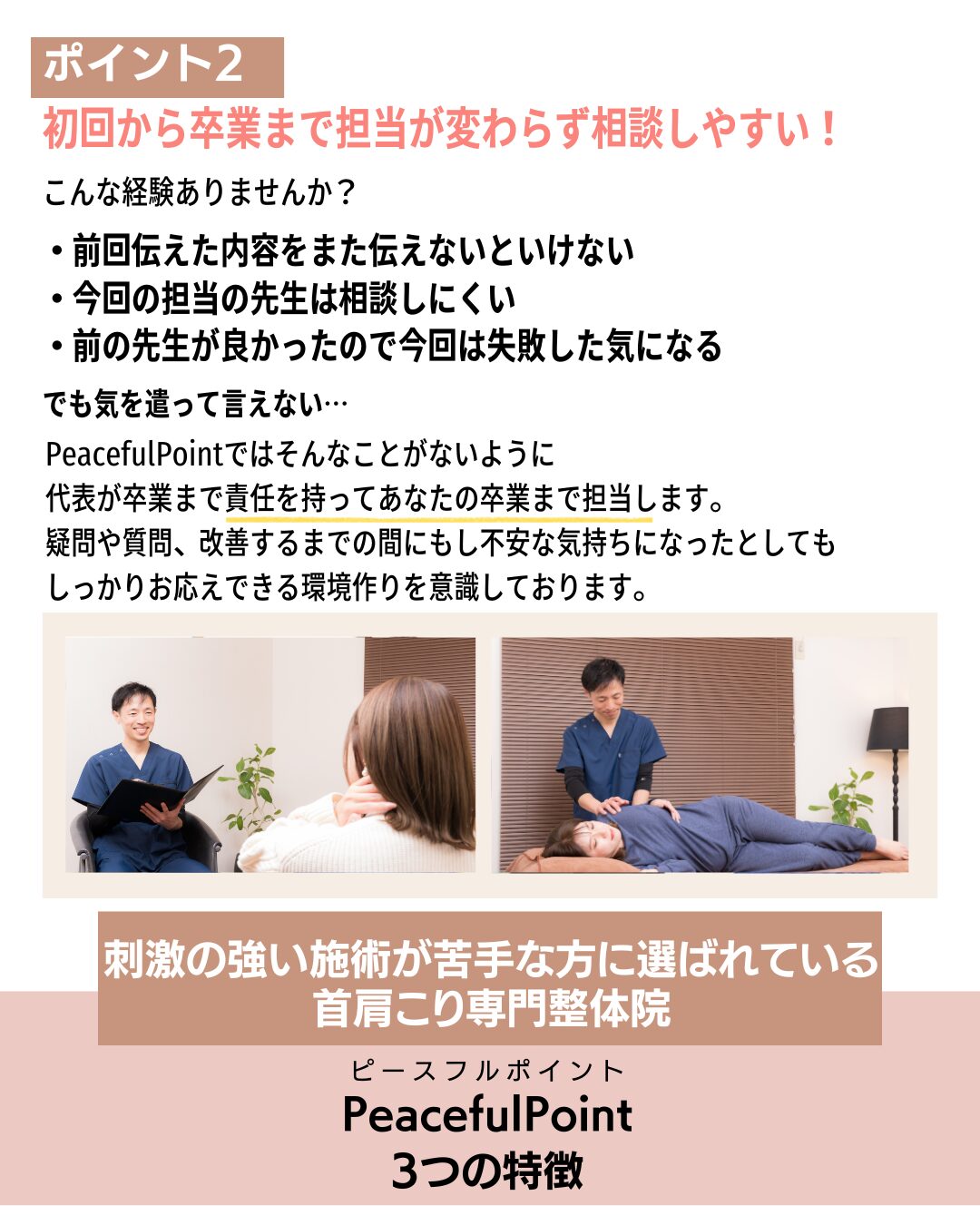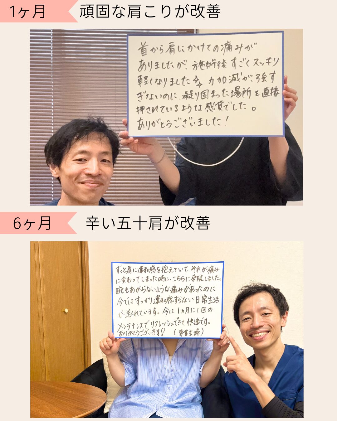 に投稿されました ユリッチTrustindex は、レビューの元のソースが Google であることを確認します。 腰痛が気になり来院しました。最初は日常生活でも違和感がありましたが、4回目の施術あたりからかなり楽になり、動きやすさを実感できるようになりました。 サロンの雰囲気は落ち着いていてリラックスでき、安心して通える空間です。先生もとても話しやすく、その時の状態をしっかり見ながら丁寧に施術してくださるので信頼できます。 毎回、施術前後に写真を撮っていただくのですが、その変化に驚きます。見た目も引き締まったように感じられ、身体のバランスが整っているのがよく分かります。 また調子が悪くなった際にはぜひお願いしたいと思います。ありがとうございました。に投稿されました 中村未紀Trustindex は、レビューの元のソースが Google であることを確認します。 施術直後はどう良くなったかがわかりませんでしたが、翌日になんとなく体が楽になっているような気がしました。偏頭痛持ちで、今回利用させていただいたので、今後も通ってみようと思います。に投稿されました M HTrustindex は、レビューの元のソースが Google であることを確認します。 長年、下半身太りと猫背に悩んでいましたが、ここに通って原因が「姿勢や体の使い方」にあることを丁寧に教えてもらえました。 毎回説明がとても分かりやすく、納得しながら受けられるので安心感があります。 正しい立ち方や歩き方を意識するだけで呼吸が楽になり、日常生活がかなり快適になりました。 目線も自然と前を向くようになり、自分でも姿勢の変化を実感できています。 その場だけ楽になるのではなく、根本から整えてくれる整体だと思います。 先生もとても信頼できるので、これからも通い続けたいです。 姿勢改善や体型に悩んでいる方にぜひおすすめしたい整体です。に投稿されました レオTrustindex は、レビューの元のソースが Google であることを確認します。 落ち着いた雰囲気のお部屋でアロマかな?良い香りも心地よかったです。 問診票の記入と全身の写真を撮っていただいてからの施術です。 施術自体は痛みを感じることなく、丁寧に説明してくださったりアドバイスもいただけるし、自宅でも出来ることを教えてくださいます。 施術後の体はスッキリした感覚でした。 ありがとうございます!に投稿されました ユウTrustindex は、レビューの元のソースが Google であることを確認します。 慢性的な首から肩にかけての鈍痛、肘の痛みと腕の痺れがあり、来店しました。初めての来店で不安でしたが、丁寧な問診に、先生の人柄がよく表れていて、施術も安心して受ける事ができました。 患部に刺激を与えない方法は、他の整骨院やマッサージ店とは全く違っていて、痛みとは関係が無いと思う場所も、実は関わりが深いそうで、こちらから色々と質問した事に対して、丁寧な説明を受けながら、全身の筋肉をほぐして下さる優しい施術でした。 清潔感漂う、落ち着いた暖色系の照明を使用した、アロマの香りのする素敵な空間にピッタリな施術で、気がつくと少し眠っていました。施術前とは比べられないほど全身が軽くなり、驚くほど痛みがなくなりました。 仕事に家事に追われ、自分の時間、リラックス出来る時間が限られている方に、是非行ってみて欲しいです。ハマると思います、自分へのご褒美も兼ねて、今後も通いたいと思いました!実際に施術を受けた翌日から1週間ほど経ちますが、痛みや痺れは無く過ごせています。 即効性もありましたが、この効き目を持続させる為のセルフケアの方法を教えて下さる点も、他店とは違う魅力を感じました。筋肉がほぐれる事で、血行も良くなったのか、むくみも軽減されています。 セルフケアの効果も実感していますが、痛みを再発させない為にも、また行きたいと思います!!に投稿されました RTrustindex は、レビューの元のソースが Google であることを確認します。 お世話になって1ヶ月ほど経ちました。 もう何年も前から右肩甲骨、右肩、右首筋、頭痛がありかなり辛い思いをしていました。 側湾症で(手術はしたが)やはり今までの蓄積は大きく体のバランスが悪く色んなところにも症状が出てました。 けど、先生に施術をしていただいた後はすごくバランスが良くなり体がすごく動きやすく生活がしやすくなりました! 主訴だったところも良くなるのを期待しこのままお世話になろうと思います^ ^ 先生も気さくで話しやすく、個人でしてらっしゃるので整骨院みたいなバタバタ感がなく ゆっくり丁寧にしてもらえるのでとても良いです⭐︎ 私みたいに側湾症で辛い思いをしている人、 肩や首からがしんどい人にぜひおすすめしたいです!に投稿されました くるりんTrustindex は、レビューの元のソースが Google であることを確認します。 慢性的な腕の痛みがあり、重だるく、日によっては痛みが酷かったり、痺れたり。病院に通院もした事はありましたが、特に骨や筋に